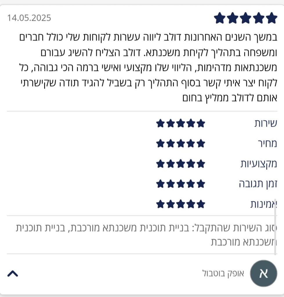 דולב מחלוף וחברת HOMIE פיננסים משלבים מקצועיות, ניסיון ויחס אישי בכל תהליך משכנתא. המעטפת הרחבה של קבוצת איסקוב, ההישענות על ידע פיננסי מעמיק והיכולת להתמודד עם מצבים מורכבים הופכים את הייעוץ לכלי חיוני עבור כל רוכש נכס. משפחות רבות זכו לחיסכון משמעותי בזכות התכנון הנכון והשירות המקצועי של HOMIE פיננסים, והדרך לבית הנכון הופכת פשוטה ברורה.